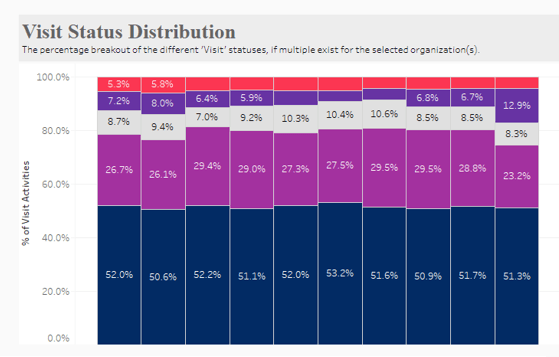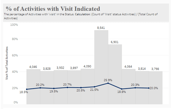 The Visit Activity Dashboard provides visibility into the percentage of activities with a status indicating a visit. These statuses are identified by the word "visit" being present in the status. Additional information provided when on-hovered.