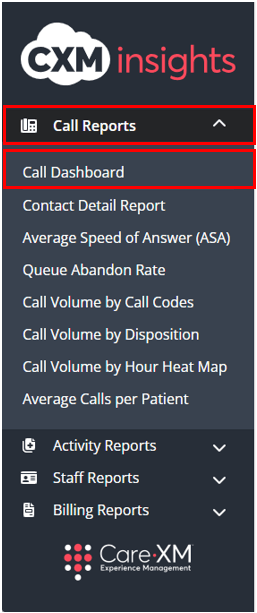 The Call Dashboard has six tiles reporting the Call Volume, Average Speed of Answer (ASA), Average Handle Time (AHT), SLA Percentage (Calls Answered under a specified amount of seconds), and the Percentage of Calls Answered by Team. Each tile/report has a row for each team (except for the Top Activity Call Codes report). On the bottom, there is a summary table with data relevant to the report.