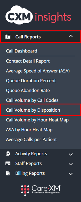 - Disposition: The report can filter by disposition, which displays what happened with the call.