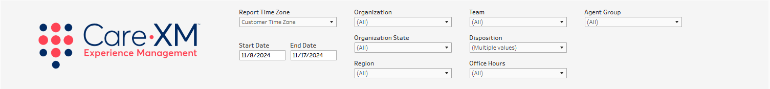 The report can be filtered by Report Time Zone, Organization, Team, Agent Group, Date Range, Organization State, Disposition, Region and Office Hours. The report is pulled by default date, which is today minus 10 days.