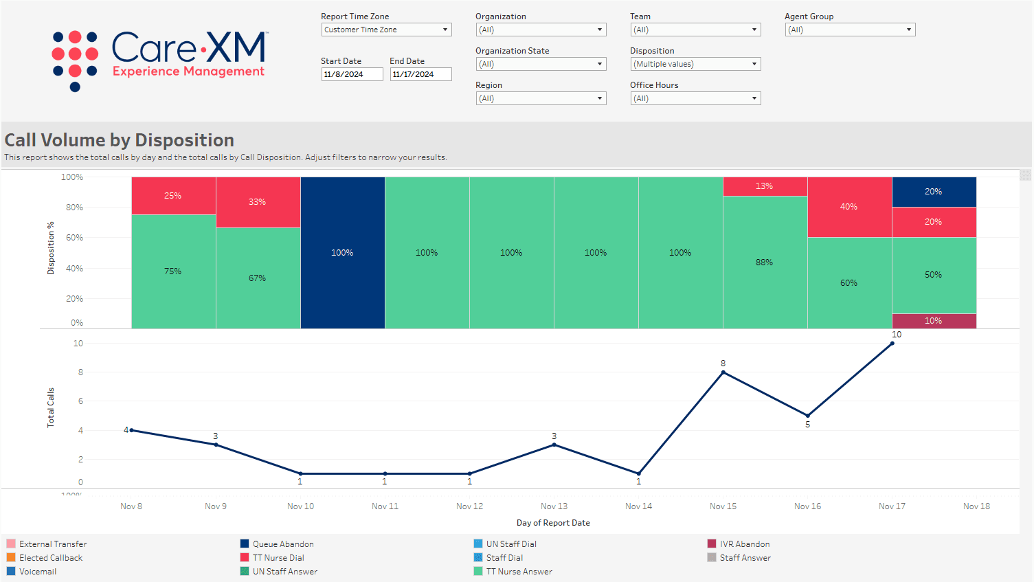 The Call Volume by Disposition report displays the total calls by day and the "Disposition" or how the call was handled.